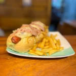 Preparado con una jugosa salchicha ranchera, este delicioso perro incluye pollo desmechado, carne desmechada, chorizo, butifarra y jamón, creando una combinación irresistible de sabores tradicionales. Se complementa con verduras frescas, salsas especiales de la casa y una generosa porción de papas a la francesa crujientes, que hacen de cada bocado una experiencia completa.